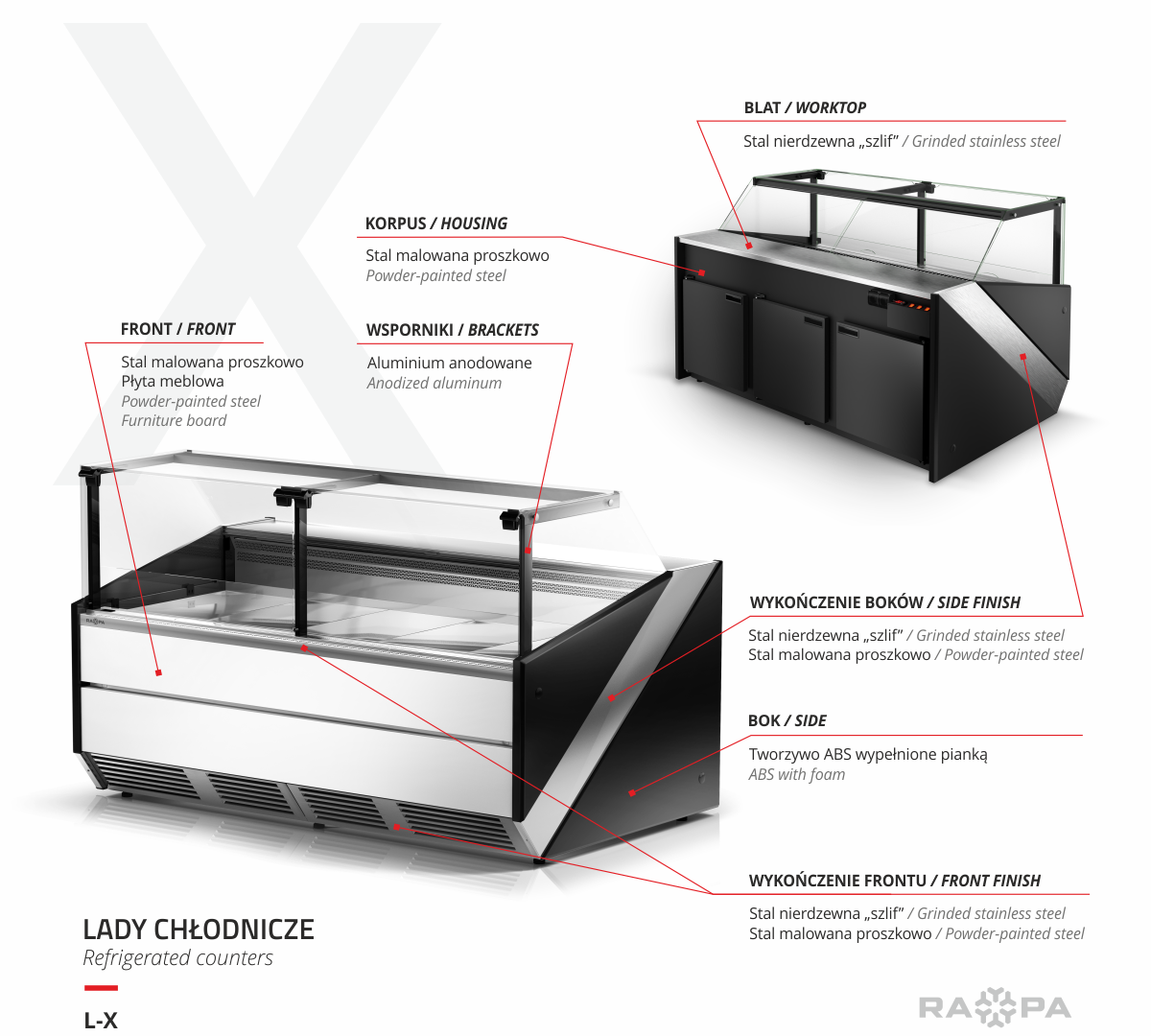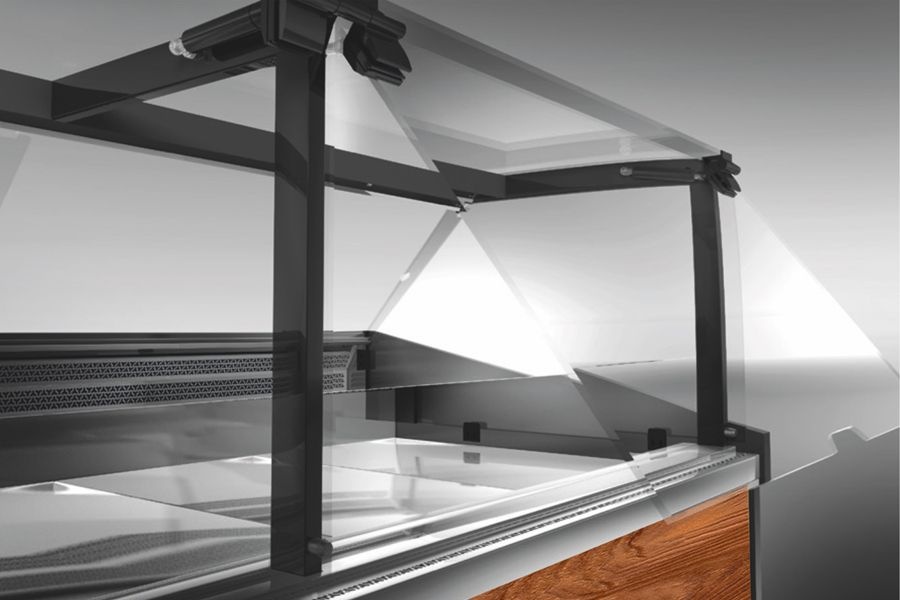 Najnowsza lada chłodnicza RAPA model X wyróżnia się systemem otwierania szyb na siłownikach typu lift-up. Konstrukcja opiera się na anodowanych profilach aluminiowych w kolorze głębokiej czerni. Zainstalowane w systemie siłowniki zostały dobrane indywidualnie do wymiaru urządzenia, aby zapewnić najwyższy komfort otwierania szyb czołowych oraz eksploatacji lady chłodniczej.Powierzchnia ekspozycyjna o głębokości 75 cm