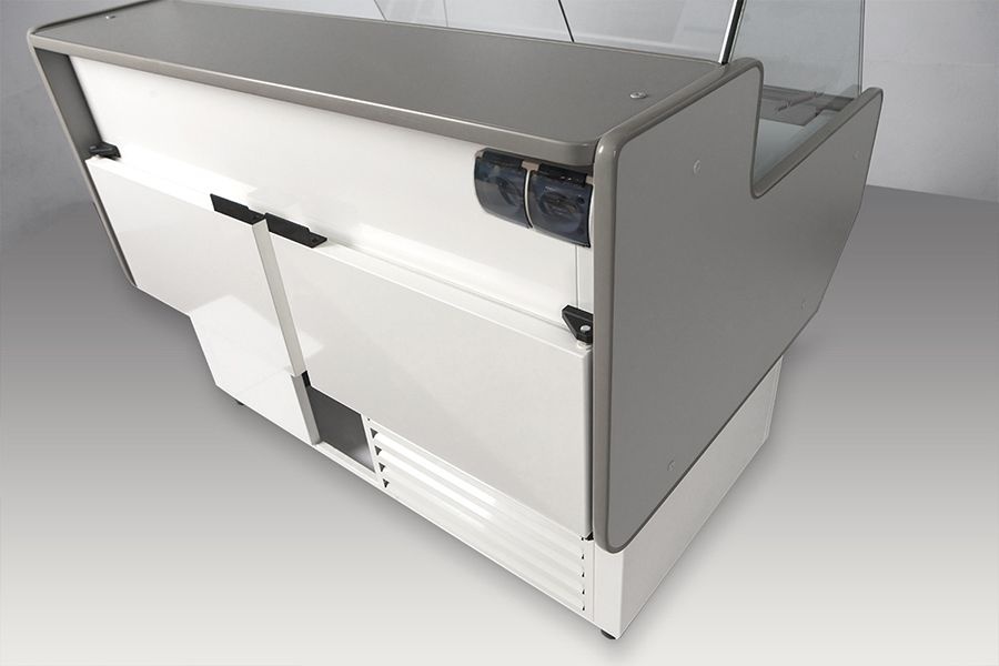 Lada chłodnicza z hartowaną dzieloną szybą prostą ukośną. W standardzie z białym korpusem, szarymi bokami i wnętrzem przechowalnika ze stali nierdzewnej.Szczegóły: