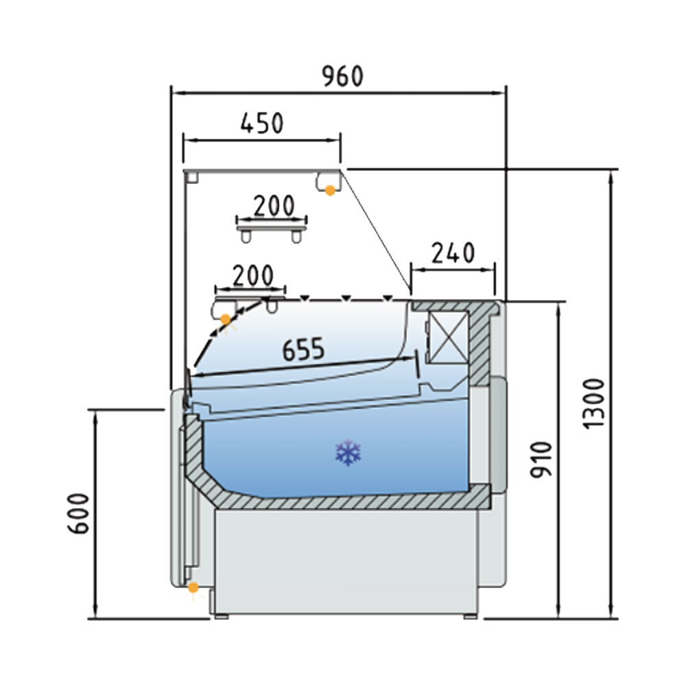 Witryna została zaprojektowana z myślą o ergonomii oraz łatwej obsłudze – szyba frontowa z hartowanego szkła jest prostokątna, otwierana i uchylna, co ułatwia dostęp i czyszczenie. Wnętrze wykonano ze stali nierdzewnej AISI 304, z przestrzenią ekspozycyjną o głębokości 700 mm, kompatybilną z tacami EURONORM i GASTRONORM. Obudowa z blachy stalowej powlekanej, izolowana pianką poliuretanową bez CFC.
