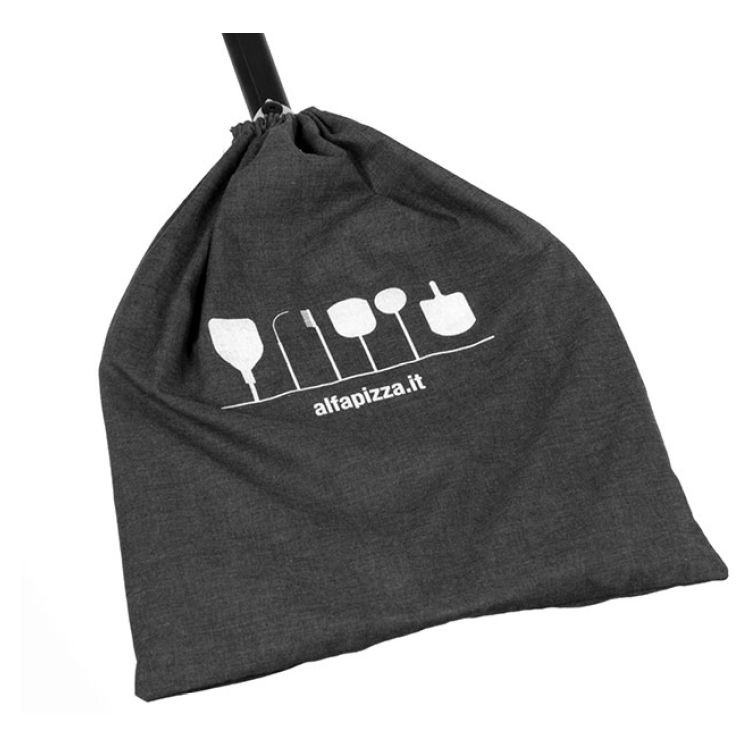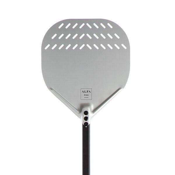 Lekkia, aluminiowa łopata do pizzy z otworami umożliwiającymi odsypianie mąki przed włożeniem pizzy do pieca. Produkt sprzedawany z pokrowcem.