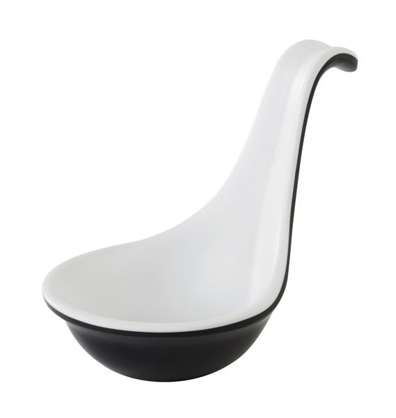 Łyżka do przystawek z serii Halftone o średnicy 55 mm, wykonana z trwałej melaminy. Z zewnątrz czarna, wewnątrz biała. Można myć w zmywarkach i sztaplować. Wytrzymuje temperaturę od -30 do +70 stopni Celsjusza.