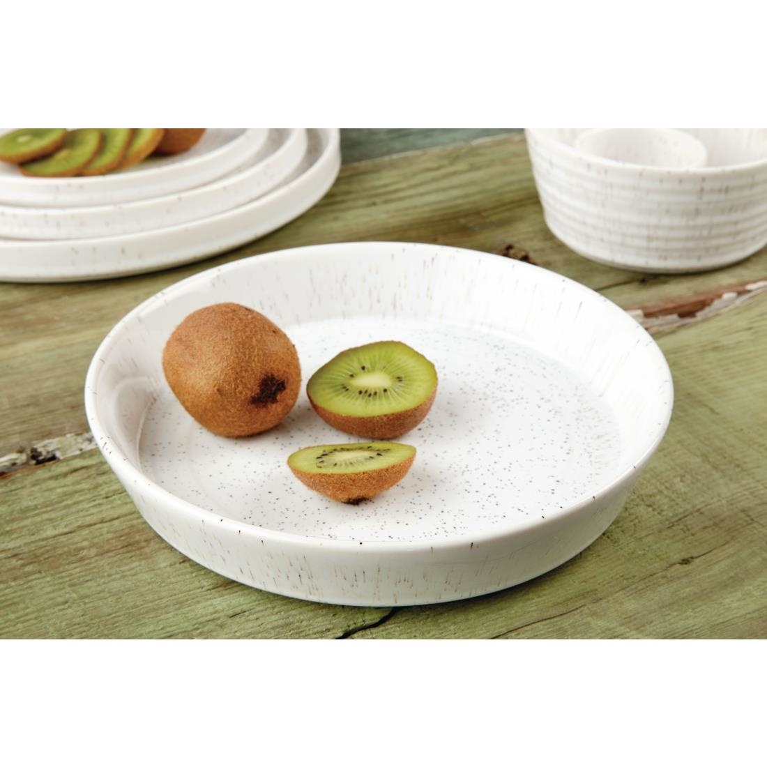 Wykonany z trwałej porcelany, talerz ten zapewnia solidność i wytrzymałość, dzięki czemu doskonale nadaje się do wymagań intensywnie wykorzystywanych środowisk gastronomicznych. Naturalne, białe plamki podkreślają naturalne barwy składników organicznych, dzięki czemu dania Twojego szefa nie tylko smakują wyśmienicie, ale także prezentują się wspaniale. Z reaktywnym wykończeniem szkliwa każdy talerz ma unikalny wygląd, co dodaje autentycznego, rustykalnego uroku Twojej zastawie stołowej. Płaska podstawa umożliwia łatwe serwowanie, pozwalając na stylową prezentację kulinarnych dzieł. Konstrukcja odporna na wysoką temperaturę oferuje elastyczność podczas podgrzewania lub przygotowywania potraw, pozwalając szefom kuchni utrzymać naczynia ciepłe podczas przygotowywania zamówień. Dodatkowo talerze są przystosowane do mycia w zmywarce, co ułatwia szybkie czyszczenie, umożliwiając personelowi szybką obsługę.