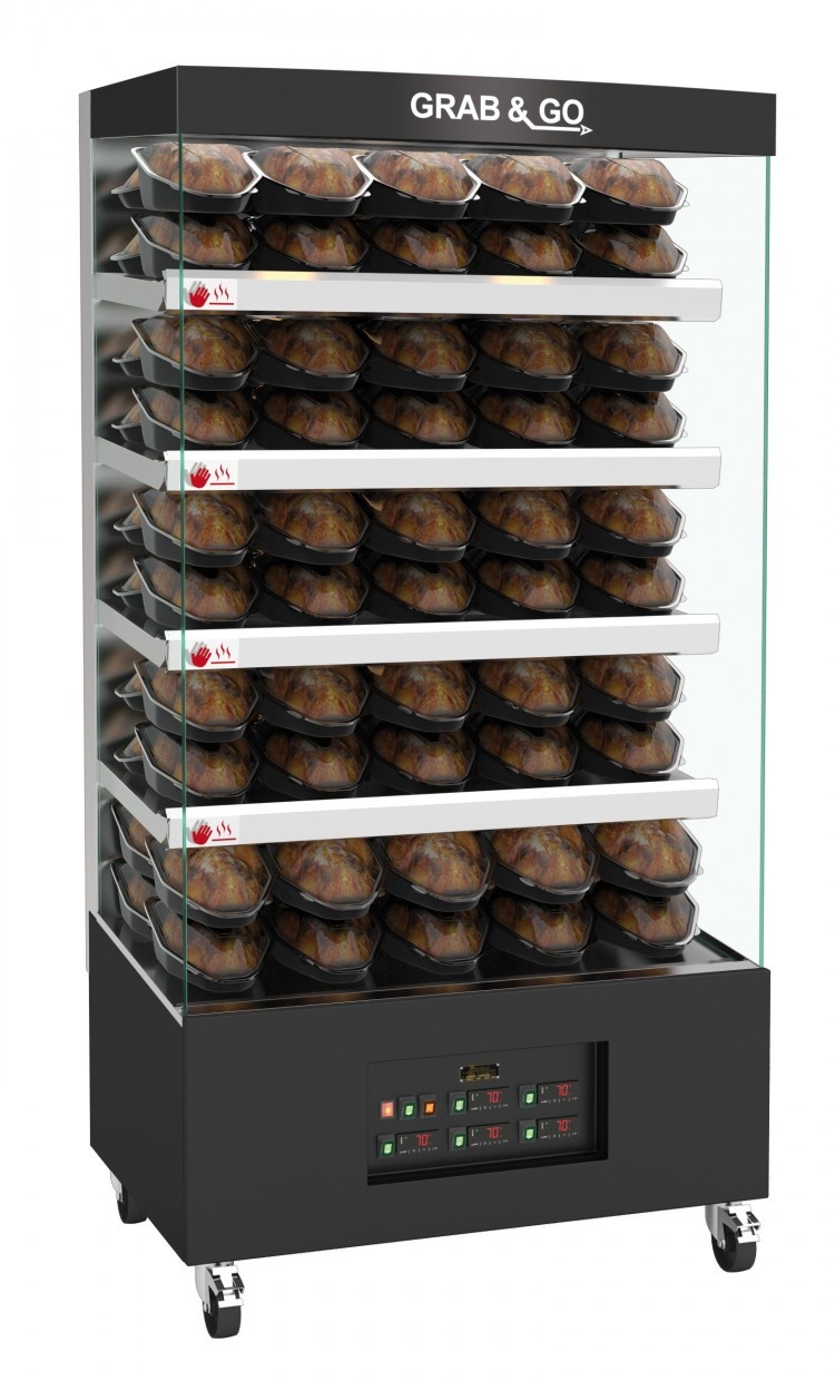 Witryna samoobsługowa z 4 półkami pod kątem 5°. Umożliwia promocyjne eksponowanie towarów. Panoramiczne widoki z niskimi półkami i bocznymi okienkami. Konstrukcja ze stali nierdzewnej z czarną bazą z epoksydową żywicą. Utrzymuje wszystkie produkty w temperaturze od +63°C do +70°C, spełniając wymagania dotyczące bezpieczeństwa żywności. Szanuje właściwości organoleptyczne wymagane dla bezpieczeństwa żywności konsumenta, niezależnie od miejsca na półce. Temperatura może być indywidualnie ustawiana na każdym poziomie (4 lub 5 stref temperatury). Optymalizacja zużycia energii. Oryginalny design z połączeniem cylindrycznej turbiny wdmuchującej i promienników ciepła. Pojemność: 46/92 kurczaków. Wymiary: S 1025 x G 735 x W 1996 mm. Półki: 5Podmiot odpowiedzialny (GPSR):
