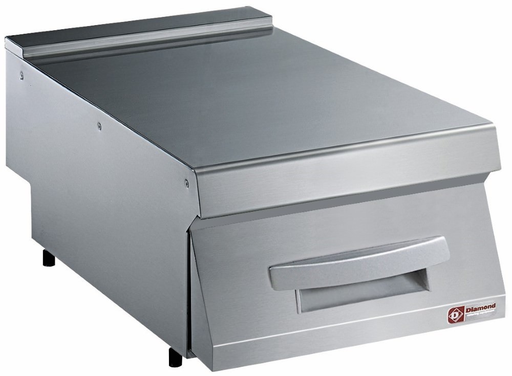 Konstrukcja została w całości wykonana z wysokogatunkowej stali nierdzewnej AISI 304, odpornej na korozję i łatwej w utrzymaniu czystości. Górna płyta robocza o grubości 15/10 mm została głęboko tłoczona, co zapewnia jej trwałość i odporność na obciążenia. Moduł spełnia normę IPX5 w zakresie odporności na wilgoć i zachlapania, co czyni go odpowiednim do intensywnego użytkowania w kuchni profesjonalnej.
