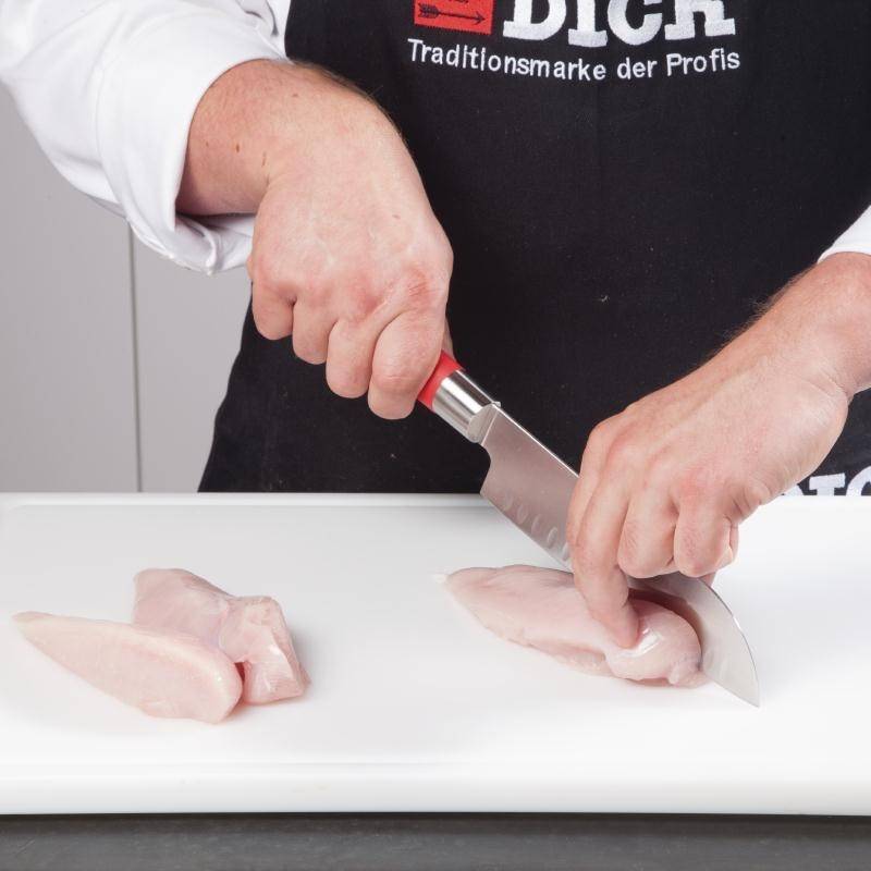 Azjatycki wzór wykonany w Niemczech. Charakteryzuje się wysoką precyzją wykonania, jakością i niezawodnością. Każdy egzemplarz jest sprawdzany laserowo, aby zapewnić ostrą krawędź. Ten nóż wykonano ze stopowej stali nierdzewnej. Nóż posiada szlif kulowy, który umożliwia formowanie się powietrza pomiędzy powierzchnią żywności i ostrzem co zapobiega przyklejaniu się.