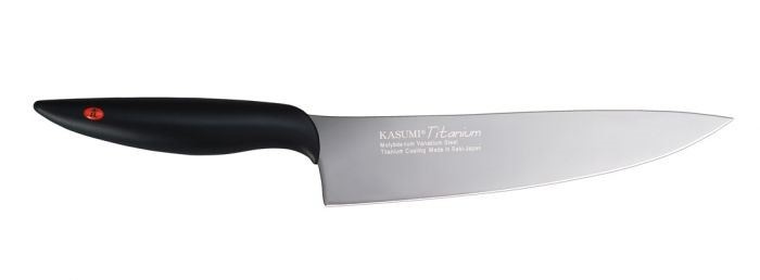 Noże TITANIUM to seria najwyższej jakości noży powlekanych tytanem japońskiej firmy KASUMI.Ostrze wykonane ze stali molibdenowo-wanadowej powlekane warstwą tytanu gwarantuje najwyższą ostrość. Powłoka tytanowa dostępna jest w trzech kolorach. Tytan jest metalem nietoksycznym a dzięki właściwości nie generowania jonów żelaza na powierzchni, krojona żywność pozbawiona jest metalicznego posmaku. Tytan jest odporny na korozję, i na ścieranie dzięki czemu noże Titanium są niezastąpionymi narzędziami w profesjonalnej kuchni. Ponadto wybór jednej z trzech wersji kolorystycznych - srebrnej, złotej bądź niebieskiej - czyni je dodatkowo stylowym elementem wystroju wnętrza.
