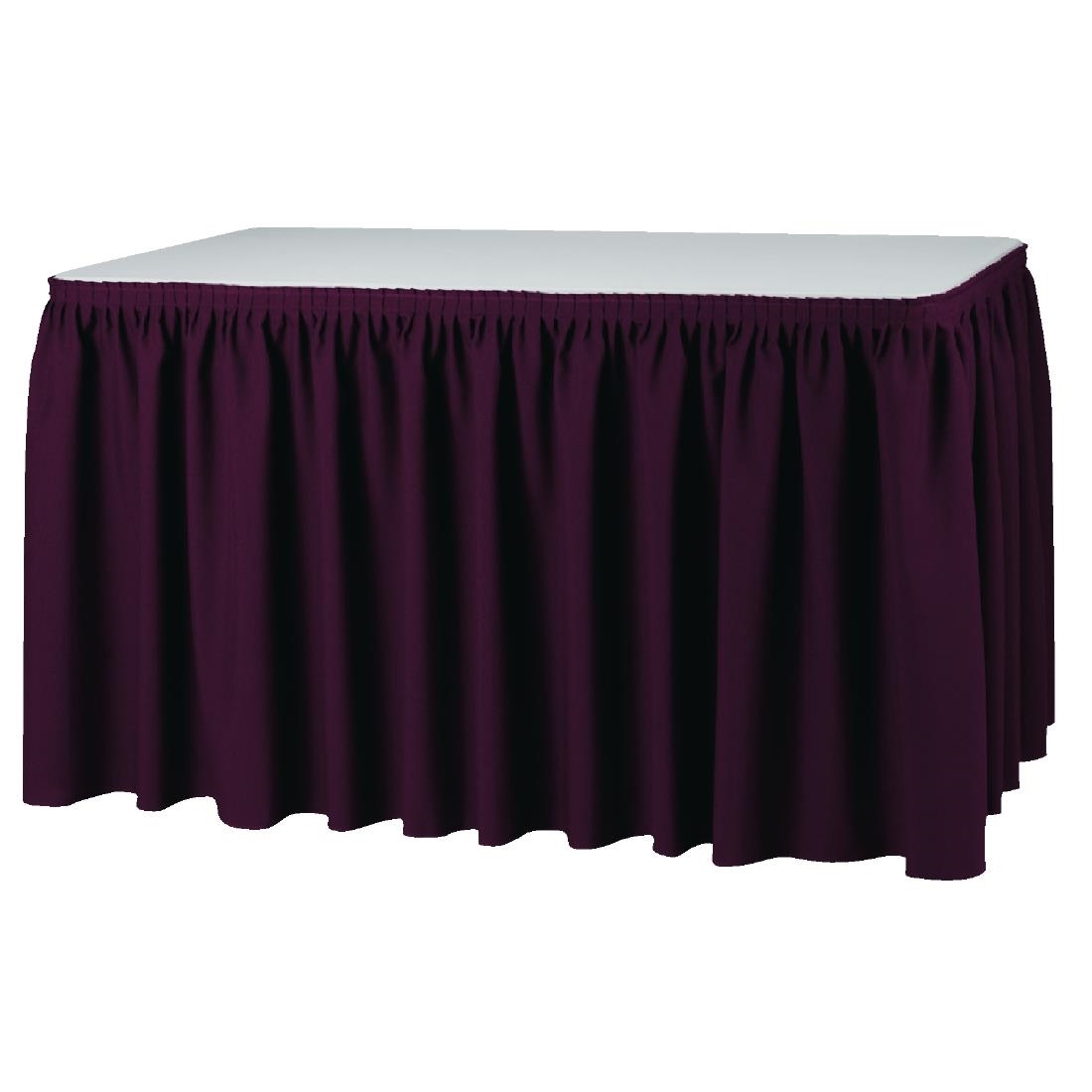 Obrus plisowany 180% Tkanina President, 100% poliester. Wysokość stołu 73 cm ze standardową długością 410 cm. Pasuje do stołu o wymiarach 120x80 cm. Łatwy w montażu dzięki samoprzylepnemu rzepowi lub plastikowym klipsom (do zamówienia poprzez obrus Boxpleat).