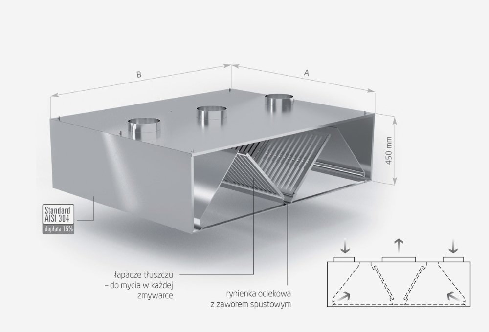 Okap centralny indukcyjny ze stali nierdzewnej o wymiarach 1300x2200x(h)450 mm
