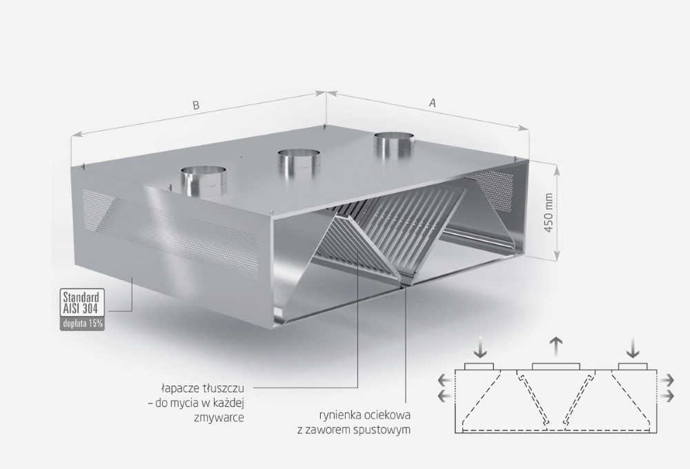 Okap centralny kompensacyjny ze stali nierdzewnej o wymiarach 1300x2400x(h)450 mm