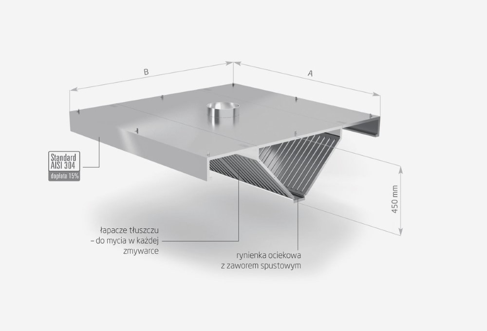 Okap centralny skośny ze stali nierdzewnej o wymiarach 1300x1800x(h)450 mm