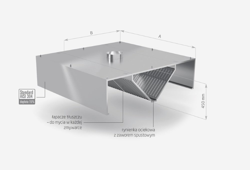 Okap centralny skrzyniowy ze stali nierdzewnej o wymiarach 2100x2000x(h)450 mm