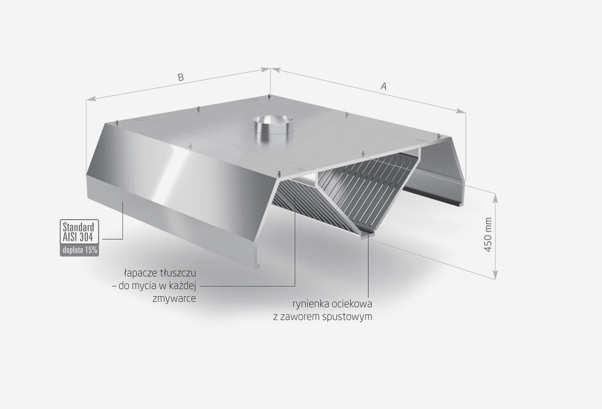 Okap centralny trapezowy ze stali nierdzewnej o wymiarach 1200x2200x(h)450 mm