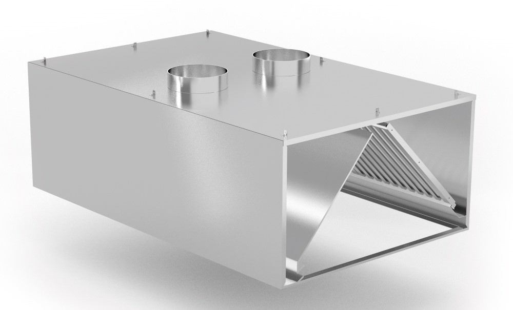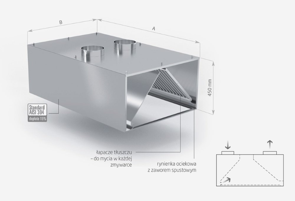 Okap przyścienny indukcyjny ze stali nierdzewnej o wymiarach 2000x1400x(h)450 mm