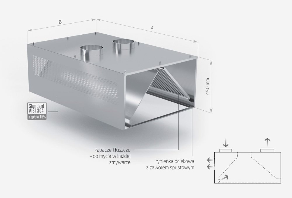 Okap przyścienny kompensacyjno-indukcyjny ze stali nierdzewnej o wymiarach 2000x1400x(h)450 mm