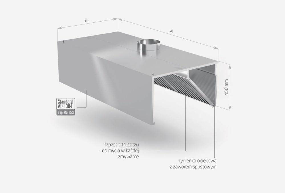 Okap przyścienny skrzyniowy ze stali nierdzewnej o wymiarach 1900x900x(h)450 mm
