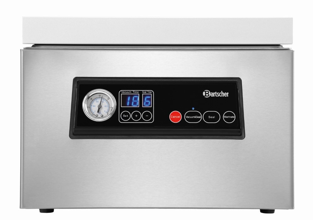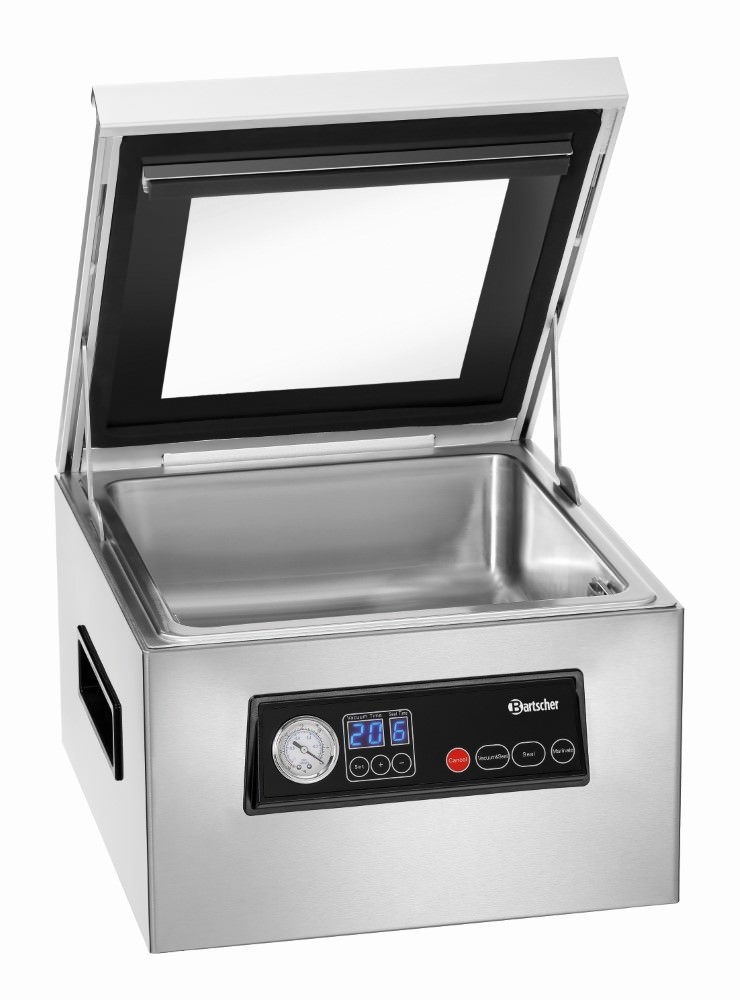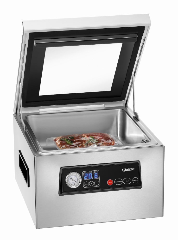 Wszystko pod kontrolą: komorowa pakowarka próżniowa jest wyposażona w szklaną pokrywę i manometr do monitorowania podciśnienia. Pałąk zaciskowy w komorze zapobiega przesunięciu torby do pakowania próżniowego.