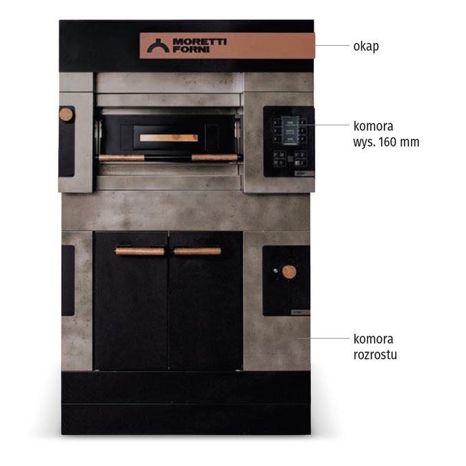 Piec 3-komorowy do pizzy z okapem i komorą rozrostu, elektryczny 16,8 kW, 890x1460x2105 mm, 6xØ450 mm, MORETTI FORNI