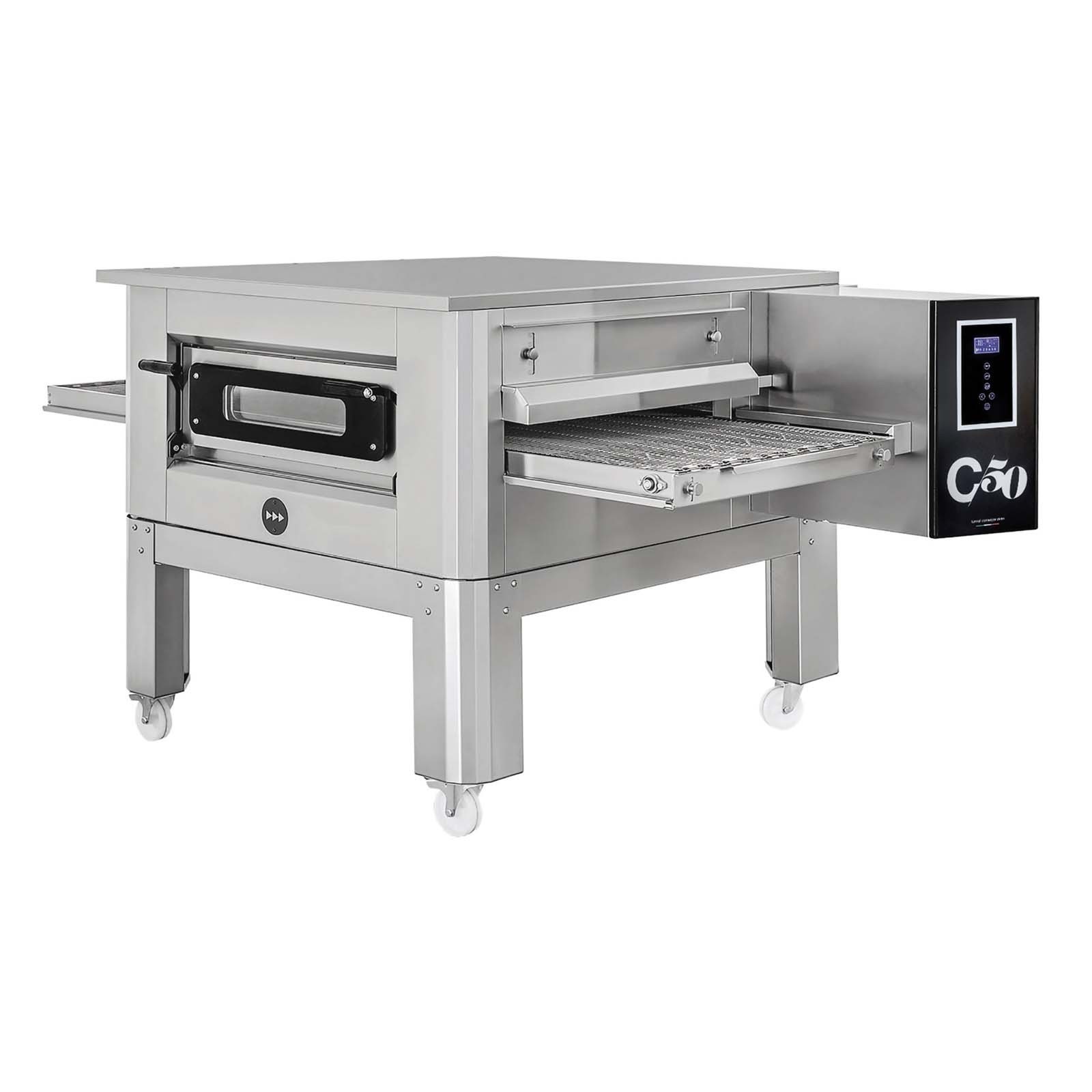 Elektroniczny piec przelotowy do pizzy z serii TUNNEL C to piec który znajduje zastosowanie nie tylko w pizzeriach, lecz również wszędzie tam, gdzie produkuje się chleb, ciasto, przygotowuje pieczone warzywa, owoce itd. Wysoką wydajność pieca osiągnięto dzięki połączeniu ogrzewania konwekcyjnego i przesuwu pieczonych produktów na taśmie wykonanej ze stali nierdzewnej. Piece tunelowe serii TUNNEL C wykonane są w całości razem z podstawą z wysokogatunkowej stali nierdzewnej. Precyzyjnie ułożona izolacja z wełny mineralnej skutecznie zabezpiecza przed nagrzewaniem się zewnętrznej obudowy pieca powyżej +40°C, co podnosi bezpieczeństwo personelu.