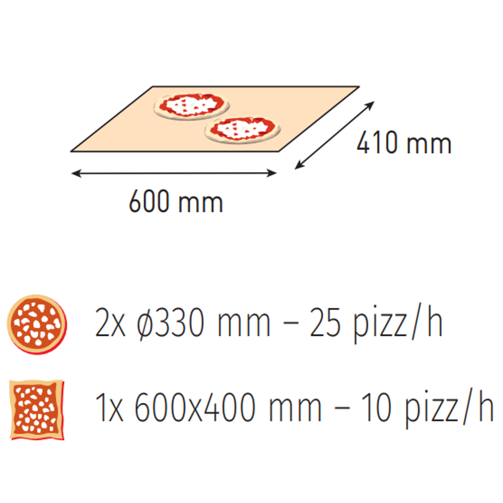 Wymiary komory pieca: 600x410x(H)80 mmMoc pojedynczej komory: 6,9 kWPojemność i wydajność pojedynczej komory pieca:2x śr. 330 mm25 pizz/h -1x 600x400 mm10 pizz/hPodmiot odpowiedzialny (GPSR):