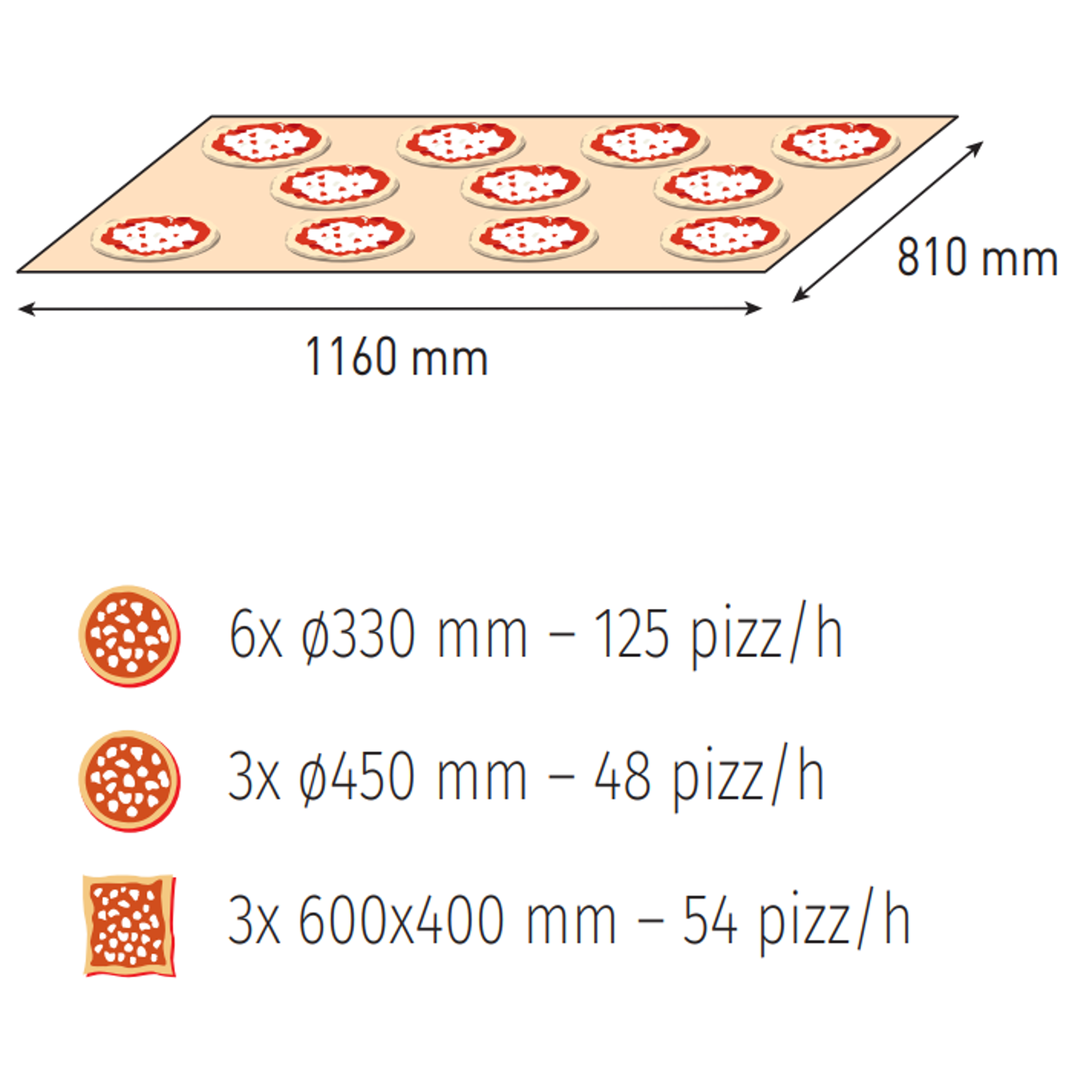 Wersja elektryczna Wymiary komory pieca: 1160x810x(H)80 mmMoc pojedynczej komory: 21,8 kW Pojemność i wydajność pojedynczej komory pieca:6x śr. 330 mm – 125 pizz/h3x śr. 450 mm – 48 pizz/h3x 600x400 mm – 54 pizz/hPodmiot odpowiedzialny (GPSR):