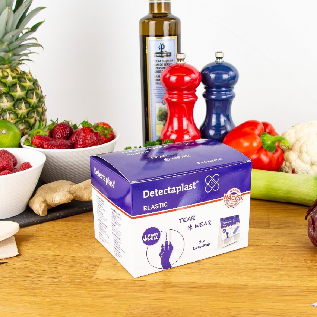 Niebieskie plastry wykrywalne, plastry cateringowe, są powszechnie stosowane w przygotowywaniu żywności, od sklepów spożywczych po rzeźnie, producentów ciast oraz linie produkcyjne żywności w dużej skali Plastry są natychmiast wykrywalne dzięki niebieskiemu kolorowi (nie ma naturalnych produktów spożywczych, które są niebieskie), a także dzięki folii aluminiowej pod podkładem rany, którą można wykryć za pomocą detektorów metalu.