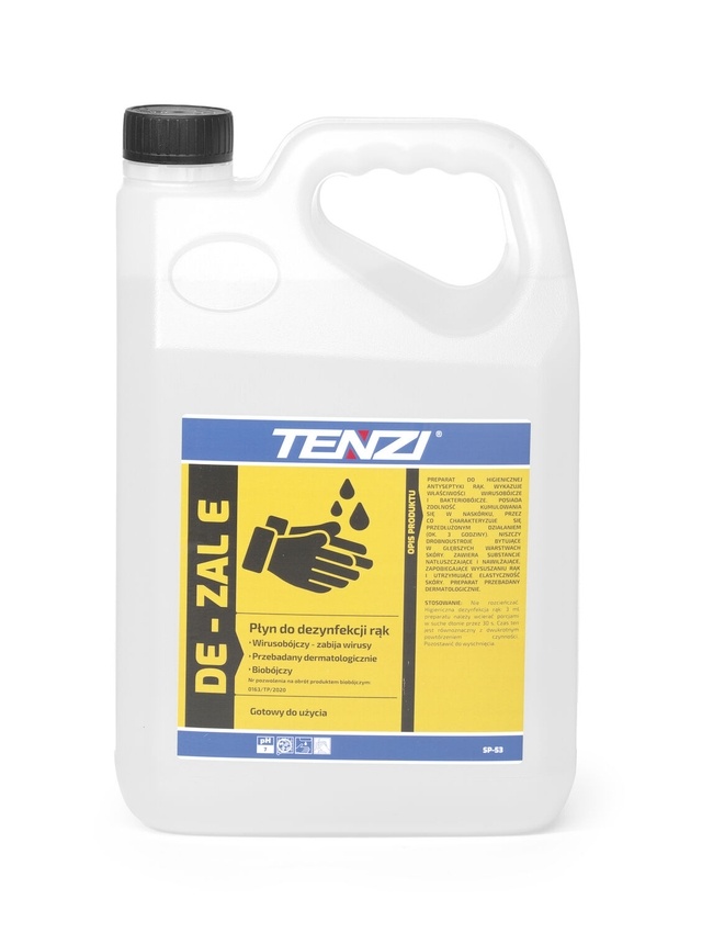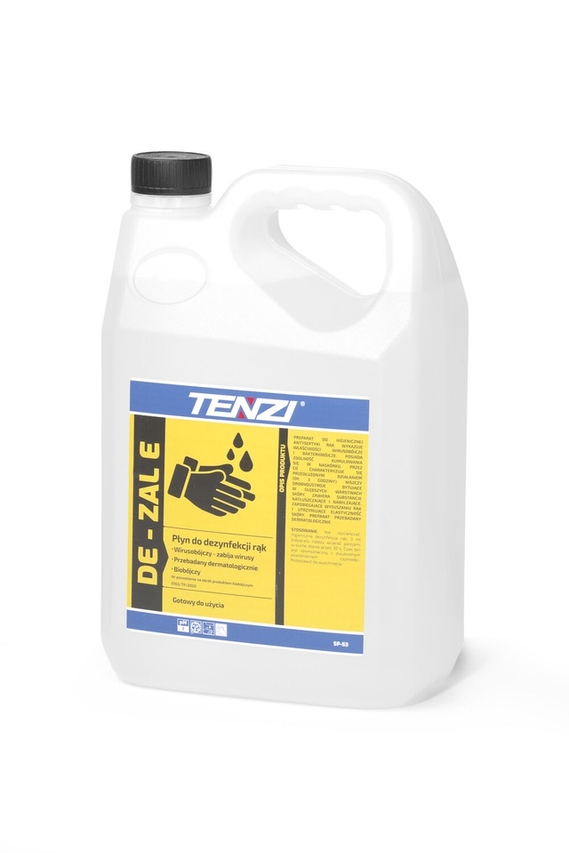 De–Zal E to płyn do dezynfekcji rąk o działaniu wirusobójczym. Dzięki unikalnej formule produkt posiada zdolność kumulowania się w naskórku, przez co charakteryzuje się przedłużonym działaniem (ok. 3 h). Niszczy drobnoustroje bytujące w głębszych warstwach skóry, które uwalniają się od rękawic np. podczas zabiegów. Zawiera substancje natłuszczające i nawilżające, zapobiegające wysuszaniu rąk i utrzymujące elastyczność skóry.