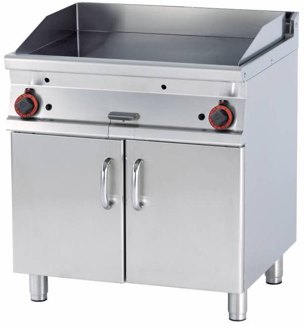 Gazowa płyta grillowa 760 x 510 mm, ryflowana, superchromowana, 2 strefy grzewcze, 14 kW na podstawie z szafką