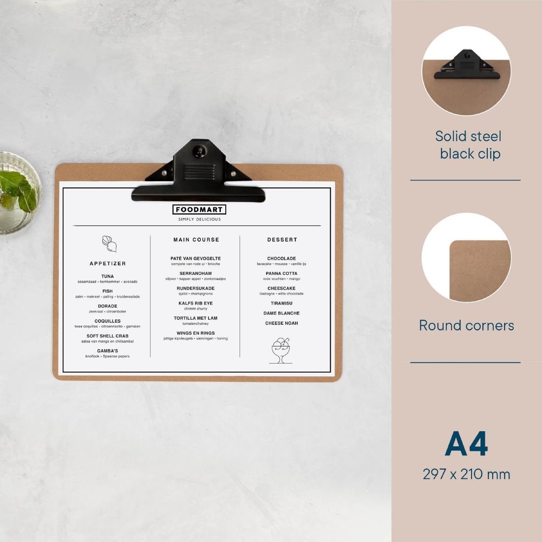 Solidne, odporne na rdzę metalowe klamry zapewniają pewny chwyt, aby ważne dokumenty były trzymane na miejscu i schludnie zorganizowane. Deska posiada również mały otwór na górze, dzięki czemu łatwo możesz ją powiesić wszędzie, gdzie chcesz. Solidna i gładka w dotyku, wysokiej jakości drewniana deska z klamrą została zaprojektowana do użytku z papierem A4 i jest również wyposażona w czarną klamrę (143 mm), która bezpiecznie trzyma kartki papieru. Zabierz ją wszędzie ze sobą: jeśli Twoja rutyna pracy wiąże się z dużą ilością papierkowej roboty, nasza wieszana deska z klamrą będzie Twoim wybawieniem! Lekka konstrukcja sprawia, że łatwo można zabrać deskę do szkoły lub włożyć ją do każdej torby. Bądź kreatywny: nasza drewniana deska to praktycznie pusta powierzchnia, czekająca na personalizację! Możesz ozdobić ją naklejkami, namalować na niej ulubiony cytat, przykleić kolorowe zdjęcia itp. Możliwości są nieograniczone.
