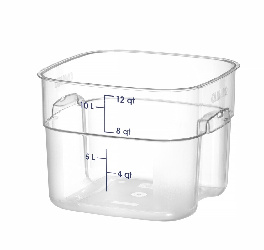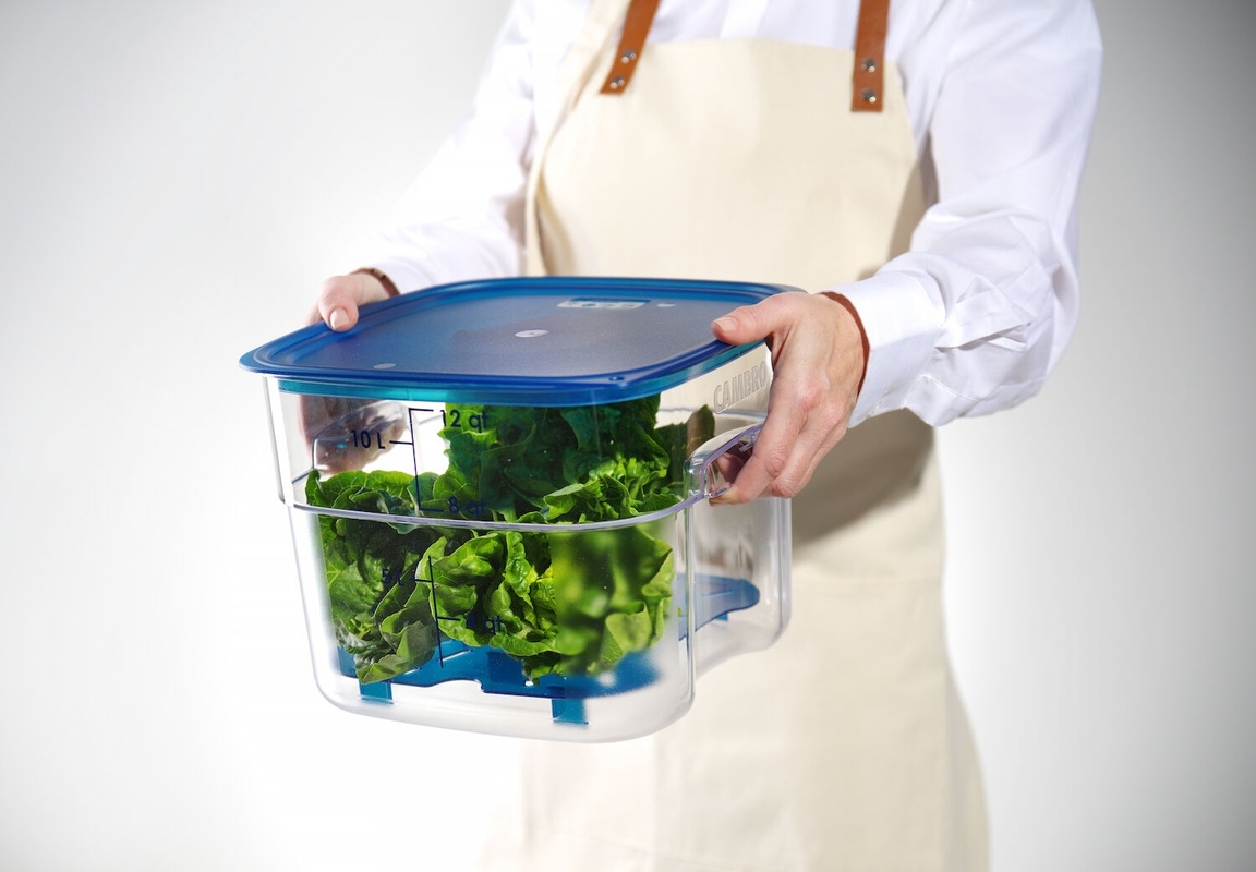 Pojemnik na żywność CamSquares® Fresh Pro firmy Cambro to wielorazowe i przyjazne środowisku rozwiązanie pozwalające na wydłużenie czasu przydatności żywności. Nadaje się do mokrych i suchych produktów. Jest idealny do przechowywania ziół i przypraw, warzyw, mięs, owoców morza czy płynów. Wykonanie z poliwęglanu, materiału odpornego na odbarwianie się, kwasy spożywcze i zapachy, sprawia, że pojemnik jest niezwykle wytrzymały i tym samym doskonale się sprawdzi w profesjonalnych kuchniach. Teksturowana powierzchnia z boku, zaokrąglone rogi i ergonomiczne uchwyty zwiększają wygodę użytkowania. Pokrywki są sprzedawane oddzielne (dostępne w HENDI).Wytrzymały, nie odbarwia się ani nie chłonie zapachówPomaga wydłużyć czas przydatności produktówWygodne użytkowanie dzięki miarce, uchwytom i zaokrąglonym rogomOdporny na temperaturę od –40°C do 99°CNadaje się do mycia w zmywarce Wykonany z poliwęglanu – wytrzymały, odporny na pęknięcia i złamania, oleje i kwasy spożywcze, nie odbarwia się ani nie absorbuje zapachów.Przeznaczony do suchych i mokrych produktów.Ergonomiczne, wpuszczane uchwyty (dla zwiększenia miejsca do przechowywania, gdy pojemniki są umieszczone obok siebie), z otworami odpływowymi.Tekstura z boku zwiększająca przyczepność – ułatwia przenoszenie.Z miarką po boku, w jednostkach metrycznych i imperialnych (kwarty i litry).Kolor miarki dopasowany do kolorów pokrywek i ociekaczy – sprzedawane oddzielnie, dostępne w asortymencie HENDI.Zaokrąglone rogi umożliwiające bezpieczne przelewanie zawartości z czterech stron.Odporność termiczna: od −40°C do 99°C.Nadaje się do mycia w zmywarce.Dostępny w 7 pojemnościach:– 1,9 l (kod: 2SFSPROCW135),– 3,8 l (kod: 4SFSPROCW135),– 5,7 l (kod: 6SFSPROCW135),– 7,6 l (kod: 8SFSPROCW135),– 11,4 l (kod: 12SFSPROCW135),– 17,2 l (kod: 18SFSPROCW135),– 20,8 l (kod: 22SFSPROCW135).Podmiot odpowiedzialny (GPSR):