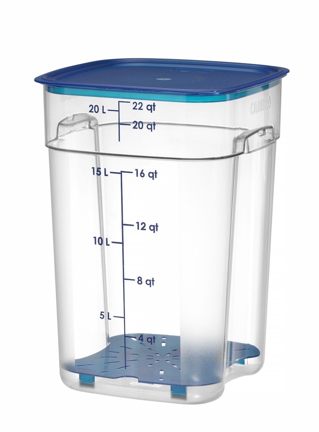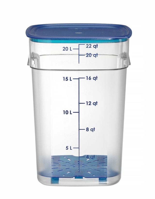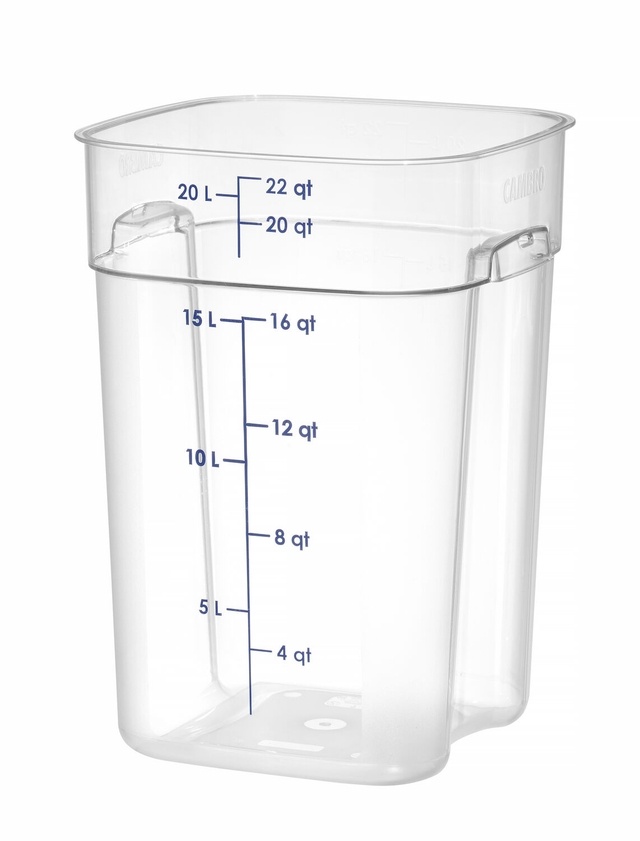 Pojemnik na żywność CamSquares® Fresh Pro firmy Cambro to wielorazowe i przyjazne środowisku rozwiązanie pozwalające na wydłużenie czasu przydatności żywności. Nadaje się do mokrych i suchych produktów. Jest idealny do przechowywania ziół i przypraw, warzyw, mięs, owoców morza czy płynów. Wykonanie z poliwęglanu, materiału odpornego na odbarwianie się, kwasy spożywcze i zapachy, sprawia, że pojemnik jest niezwykle wytrzymały i tym samym doskonale się sprawdzi w profesjonalnych kuchniach. Teksturowana powierzchnia z boku, zaokrąglone rogi i ergonomiczne uchwyty zwiększają wygodę użytkowania. Pokrywki są sprzedawane oddzielne (dostępne w HENDI). Wytrzymały, nie odbarwia się ani nie chłonie zapachów Pomaga wydłużyć czas przydatności produktów Wygodne użytkowanie dzięki miarce, uchwytom i zaokrąglonym rogom Odporny na temperaturę od –40°C do 99°C Nadaje się do mycia w zmywarce Wykonany z poliwęglanu – wytrzymały, odporny na pęknięcia i złamania, oleje i kwasy spożywcze, nie odbarwia się ani nie absorbuje zapachów. Przeznaczony do suchych i mokrych produktów. Ergonomiczne, wpuszczane uchwyty (dla zwiększenia miejsca do przechowywania, gdy pojemniki są umieszczone obok siebie), z otworami odpływowymi. Tekstura z boku zwiększająca przyczepność – ułatwia przenoszenie. Z miarką po boku, w jednostkach metrycznych i imperialnych (kwarty i litry). Kolor miarki dopasowany do kolorów pokrywek i ociekaczy – sprzedawane oddzielnie, dostępne w asortymencie HENDI. Zaokrąglone rogi umożliwiające bezpieczne przelewanie zawartości z czterech stron. Odporność termiczna: od −40°C do 99°C. Nadaje się do mycia w zmywarce. Dostępny w 7 pojemnościach: – 1,9 l (kod: 2SFSPROCW135), – 3,8 l (kod: 4SFSPROCW135), – 5,7 l (kod: 6SFSPROCW135), – 7,6 l (kod: 8SFSPROCW135), – 11,4 l (kod: 12SFSPROCW135), – 17,2 l (kod: 18SFSPROCW135), – 20,8 l (kod: 22SFSPROCW135).Dane techniczne
