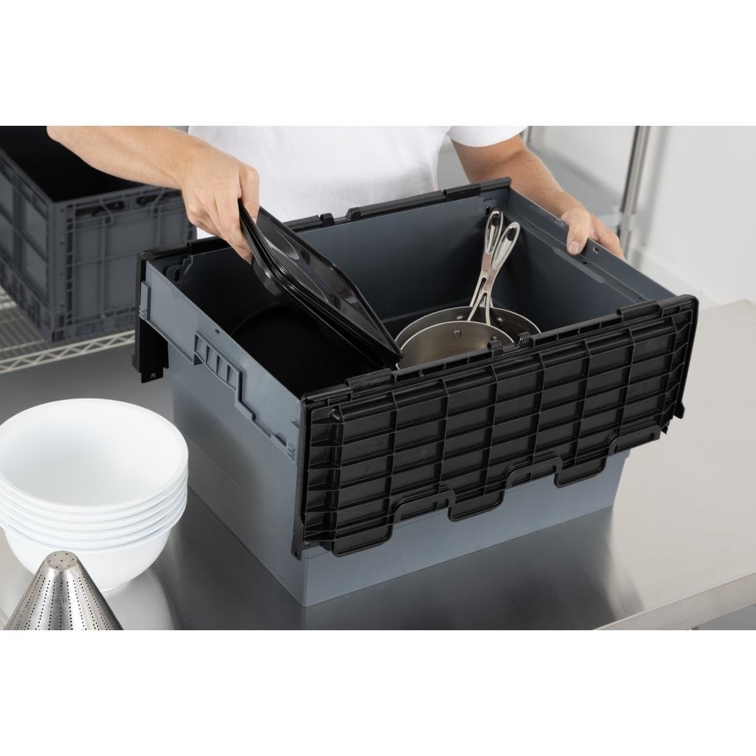 Dzięki mocnej, zazębiającej się pokrywie skrzynia jest niezwykle trwała i może być sztaplowana – zarówno z otwartym, jak i zamkniętym wiekiem. Z maksymalną ładownością 20 kg każdy pojemnik może unieść duży ciężar, a wbudowane uchwyty gwarantują pewny chwyt podczas podnoszenia. Dodatkowo skrzynia jest bezpieczna do kontaktu z żywnością, dzięki czemu może służyć do przechowywania lub transportu składników. Jest również łatwa do czyszczenia – wystarczy ją zdezynfekować i przetrzeć.