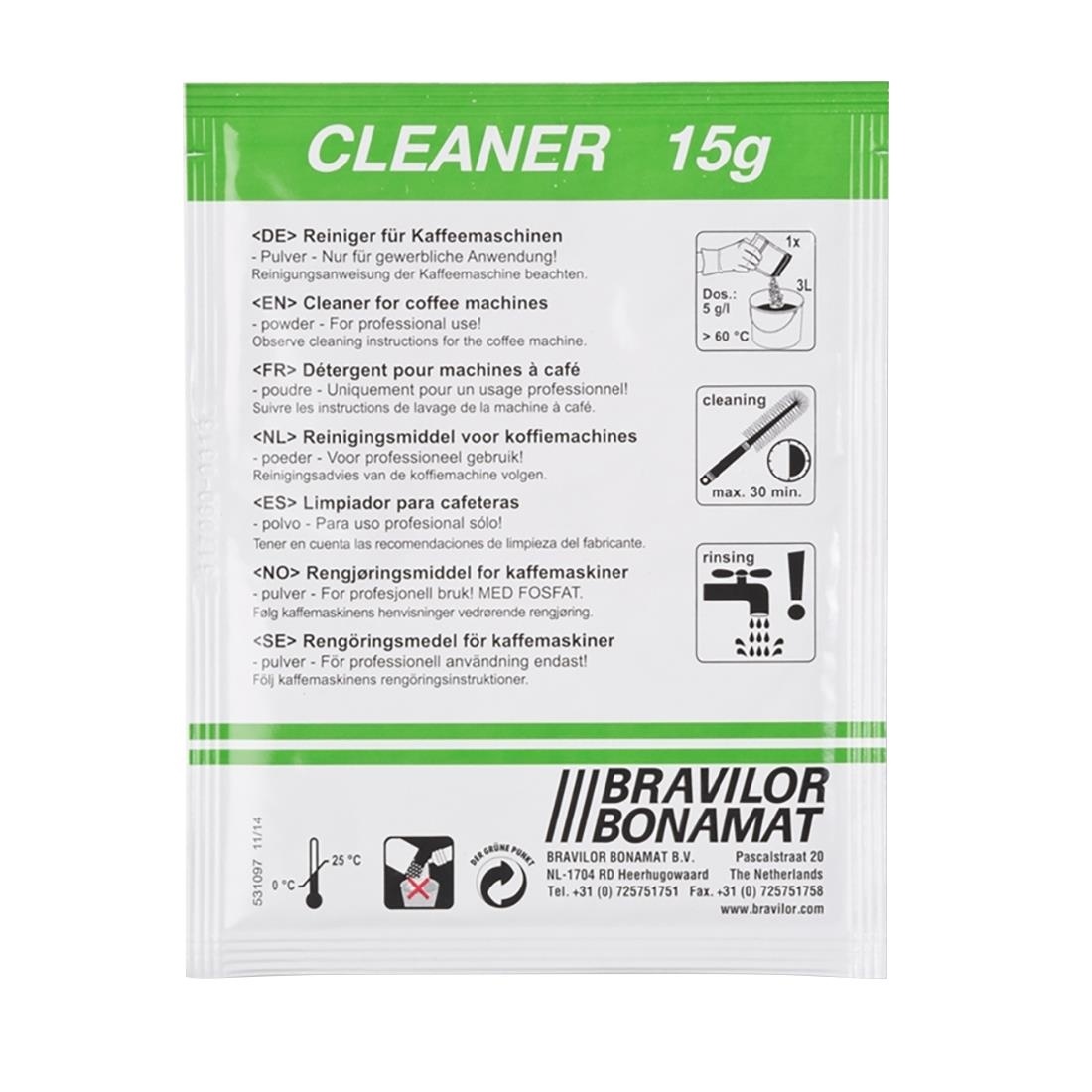 Bravilor Cleaner to środek czyszczący, który skutecznie usuwa resztki kawy i herbaty z ekspresu do kawy lub akcesoriów, takich jak airpoty Utrzymywanie sprzętu do kawy w czystości jest kluczowe dla zachowania smaku. Przed użyciem należy postępować zgodnie z instrukcjami na opakowaniu oraz w podręczniku obsługi ekspresu do kawy.