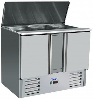 Stół chłodniczy sałatkowy 2-drzwiowy z polietylenową deską do krojenia, 3x 1/1 GN, od 2°C do 8°C, agregat na dole