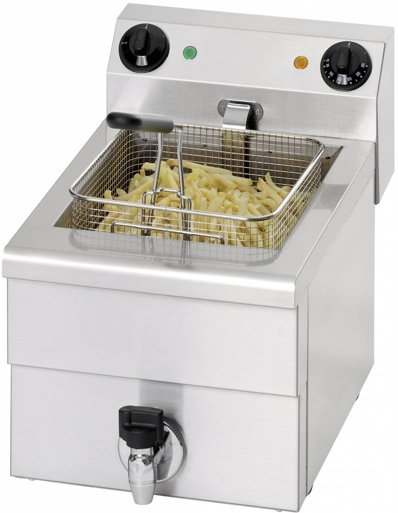 Nastawna frytownica o pojemności 10 litrów. Wykonana z wytrzymałej stali nierdzewnej. Frytownicę wyposażono w kran spustowy, kosz z ergonomicznym uchwytem, pokrętło regulacyjne i termostat bezpieczeństwa. Zakres temperatury do 180 °C.