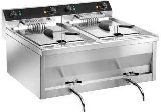 Frytownica elektryczna dwukomorowa o pojemności 2x 9 litrów. Konstrukcję wyposażono w 2 krany spustowe, 2 kosze, 2 pokrywy, lampki kontrolne i pokrętła regulacyjne. Frytownicę wykonano ze stali nierdzewnej. Temperaturę można ustawiać w zakresie do 190 °C. Wyjmowana grzałka ułatwia czyszczenie.