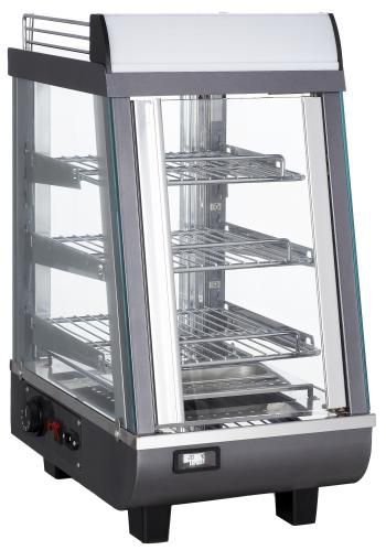 Nablatowa witryna grzewcza 76 L, 3-poziomowa, 1,20 kW, od 30 do 90 °C, z szybą skośną, srebrna