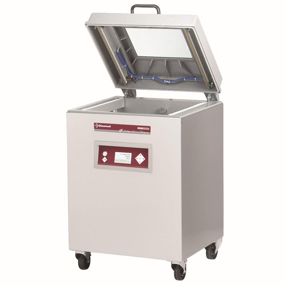 Dzięki mobilnej podstawie na czterech kołach skrętnych (dwa z hamulcem), urządzenie można łatwo przemieszczać i bezpiecznie ustawić w miejscu pracy. Opcjonalnie dostępne są funkcje dodatkowe: czujnik cieczy, system wtrysku gazu, skośna płyta dla produktów płynnych, drukarka etykiet, a także programy do marynowania i pakowania w trybie sekwencyjnym.