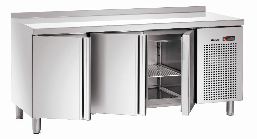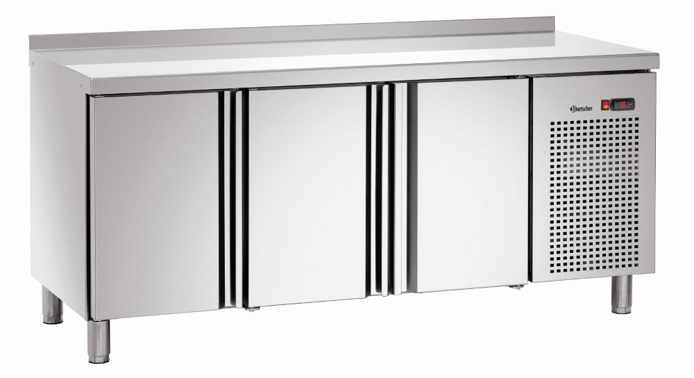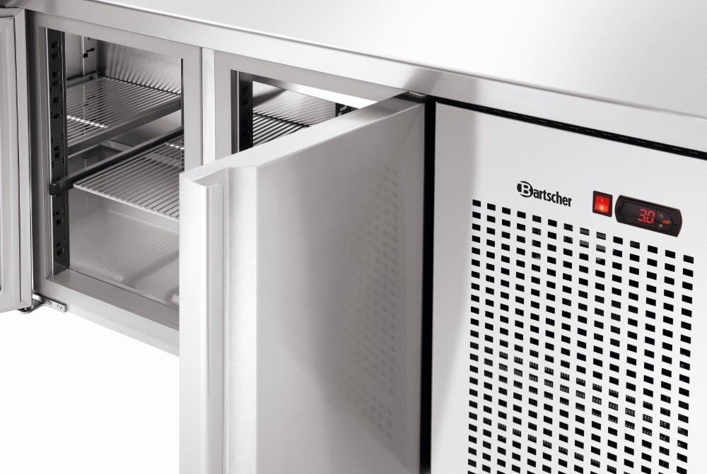 3-drzwiowy stół chłodniczy z wysokiej jakości powierzchnią roboczą ze stali szlachetnej i dużą strefą chłodzoną powietrzem obiegowym – stała i równomierna temperatura chłodzenia wewnątrz.