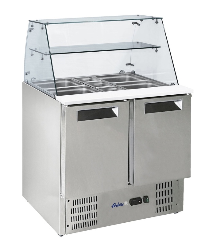 Stół chłodniczy sałatkowy 2-drzwiowy 2x 1/1 GN + 3x 1/6 GN ze szklaną nadstawą, 247 L, od 2°C do 8°C, agregat na dole