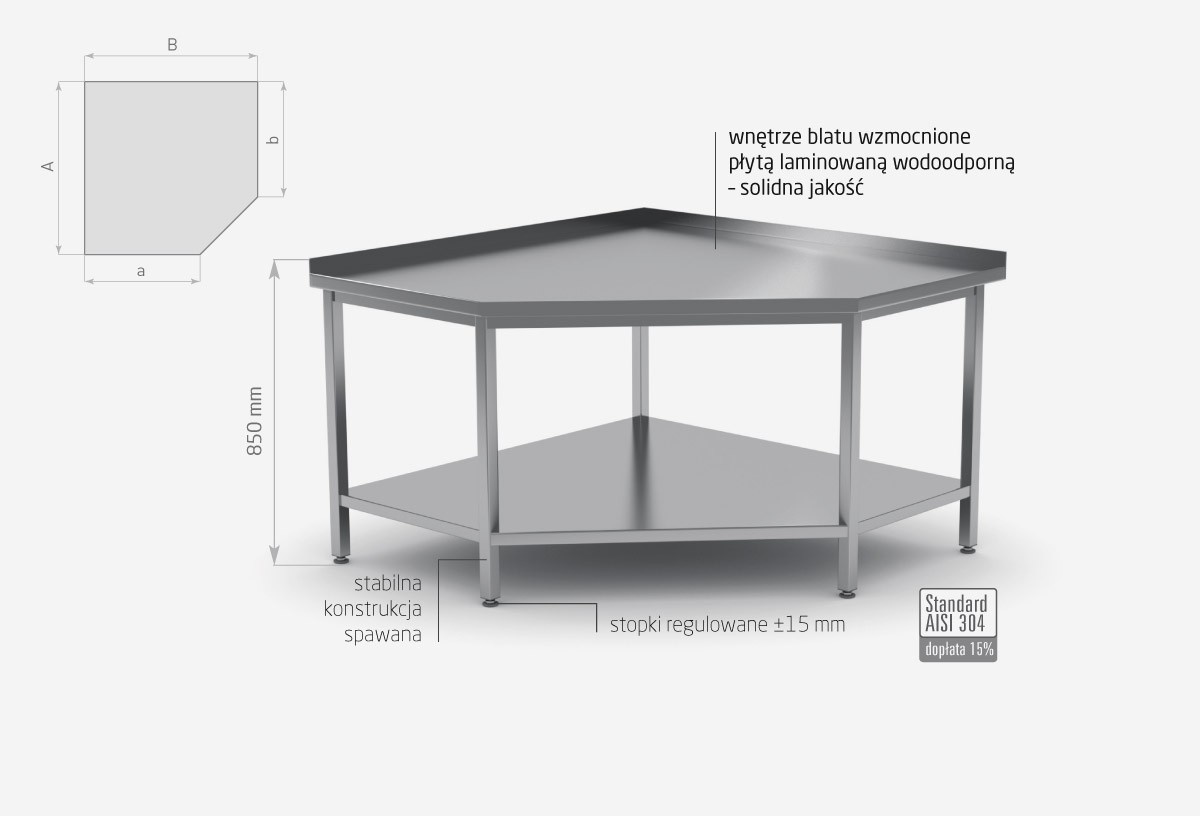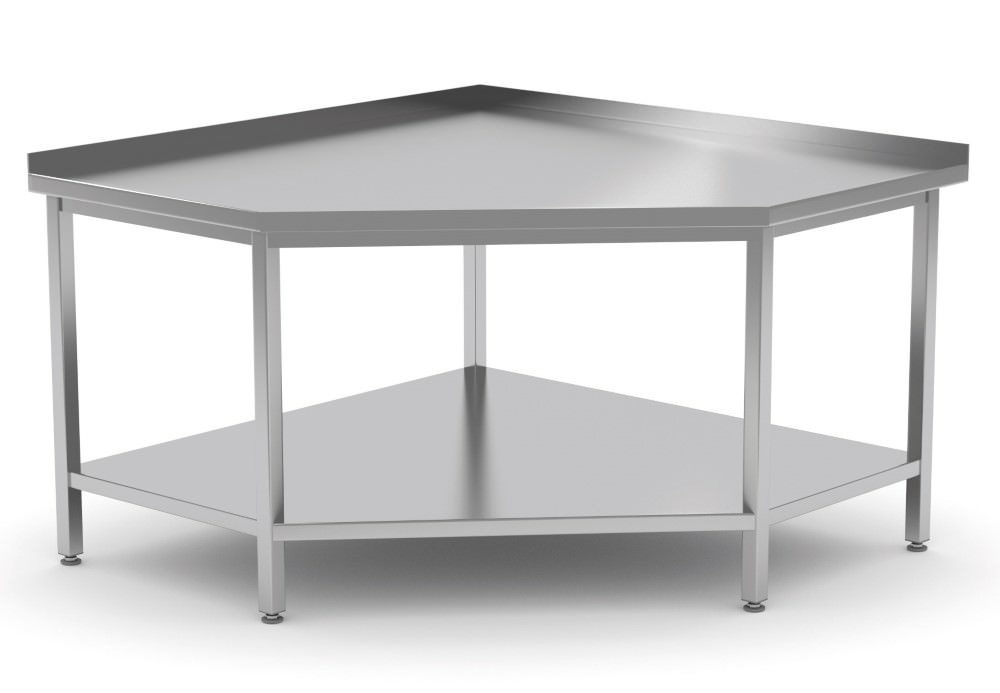 Stół przyścienny narożny ze stali nierdzewnej z półką o wymiarach 900x900x(h)850 mm