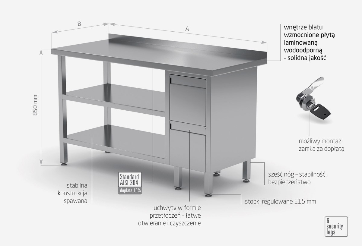 Stół przyścienny ze stali nierdzewnej, szafka z dwiema szufladami i dwiema półkami - szuflady po prawej stronie o wymiarach 1200x600x(h)850 mm