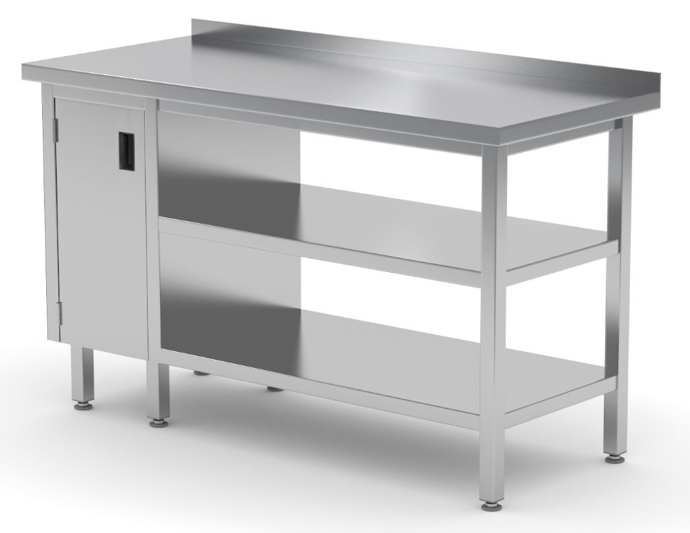 Stół przyścienny ze stali nierdzewnej, szafka z drzwiami na zawiasach i dwiema półkami - szafka po lewej stronie o wymiarach 900x700x(h)850 mm