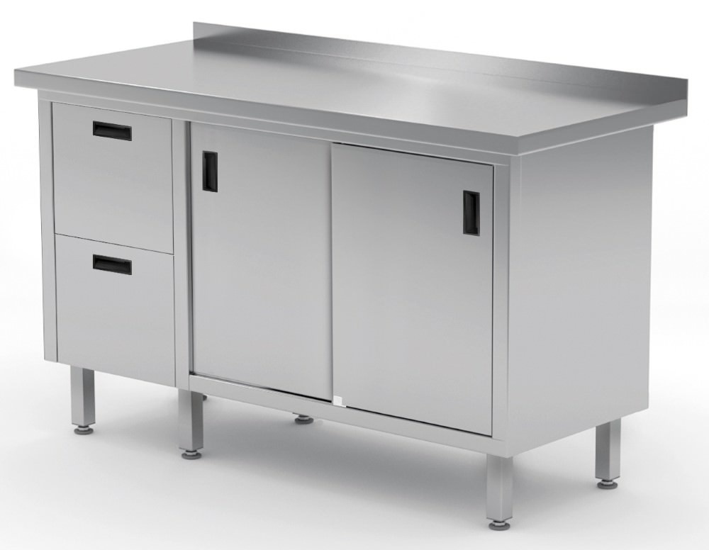 Stół przyścienny ze stali nierdzewnej, szafka z dwiema szufladami i drzwiami suwanymi - szuflady po lewej stronie o wymiarach 1300x600x(h)850 mm