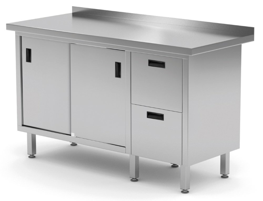 Stół przyścienny ze stali nierdzewnej, szafka z dwiema szufladami i drzwiami suwanymi - szuflady po prawej stronie o wymiarach 1400x600x(h)850 mm