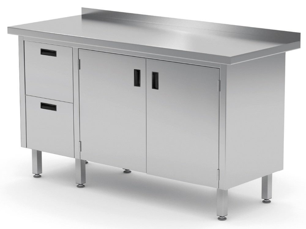 Stół przyścienny ze stali nierdzewnej, szafka z dwiema szufladami i drzwiami na zawiasach - szuflady po lewej stronie o wymiarach 1500x700x(h)850 mm