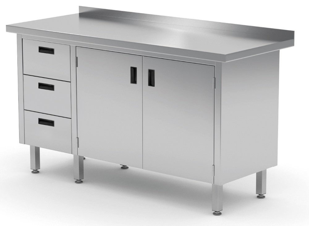 Stół przyścienny ze stali nierdzewnej, szafka z trzema szufladami i drzwiami na zawiasach - szuflady po lewej stronie o wymiarach 1700x700x(h)850 mm