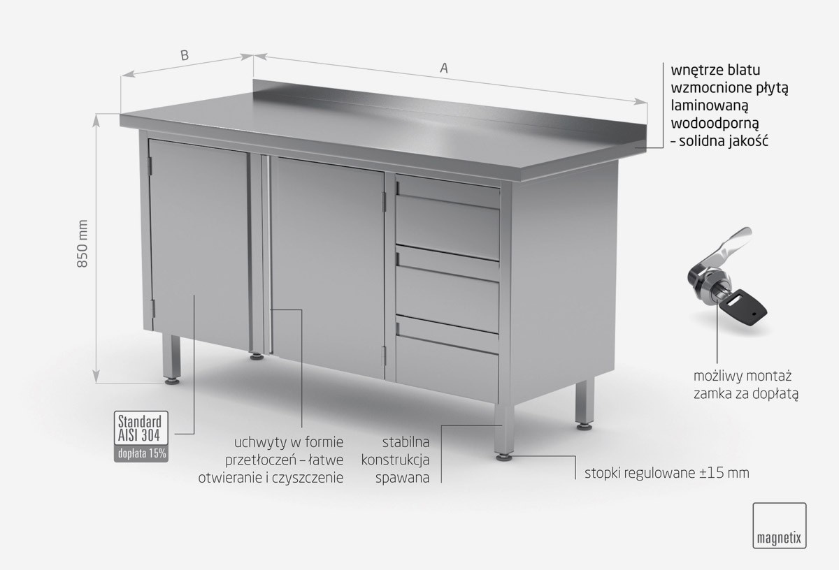 Stół przyścienny ze stali nierdzewnej, szafka z trzema szufladami i drzwiami na zawiasach - szuflady po prawej stronie o wymiarach 1100x600x(h)850 mm