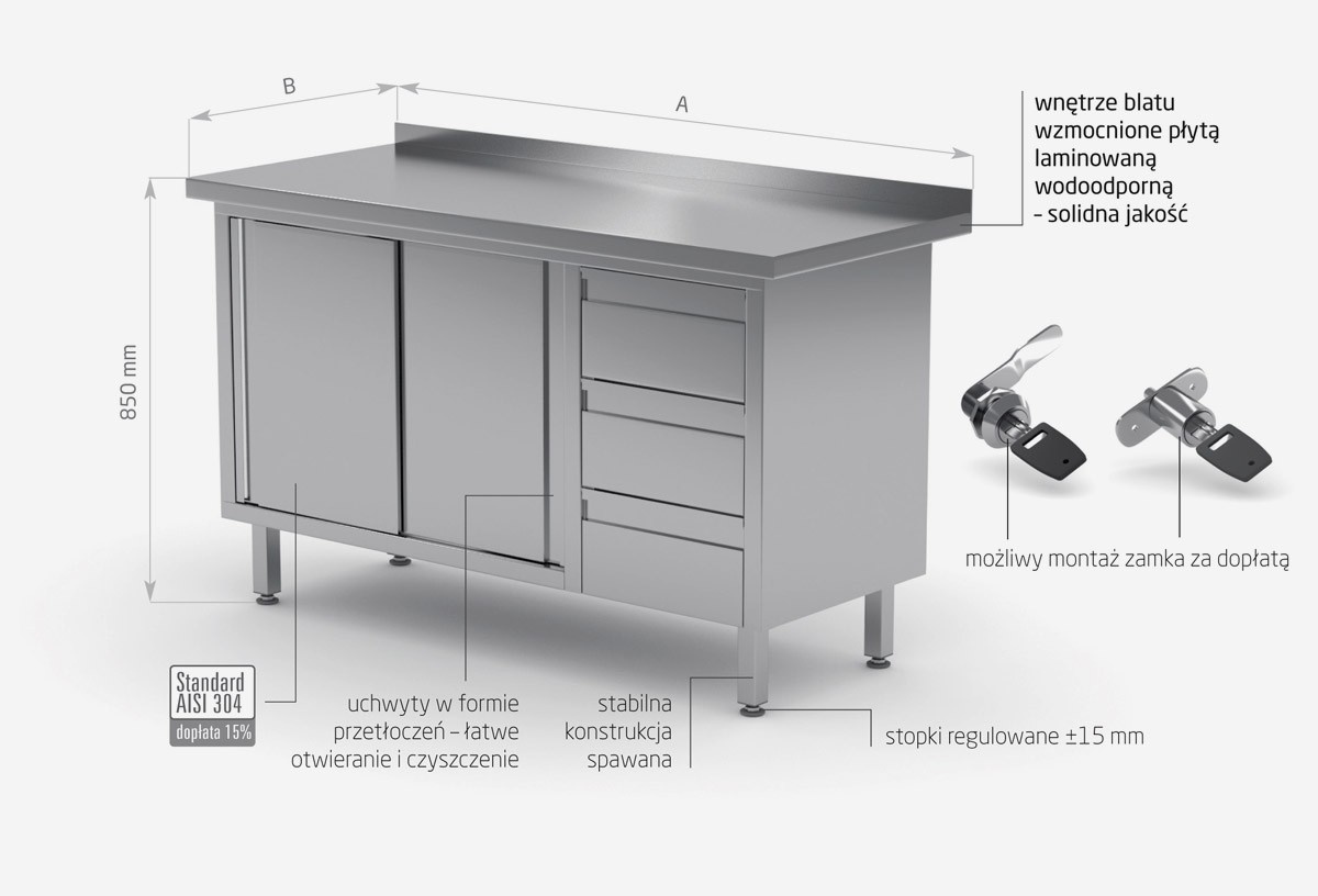 Stół przyścienny ze stali nierdzewnej, szafka z trzema szufladami i drzwiami suwanymi - szuflady po prawej stronie o wymiarach 1800x700x(h)850 mm