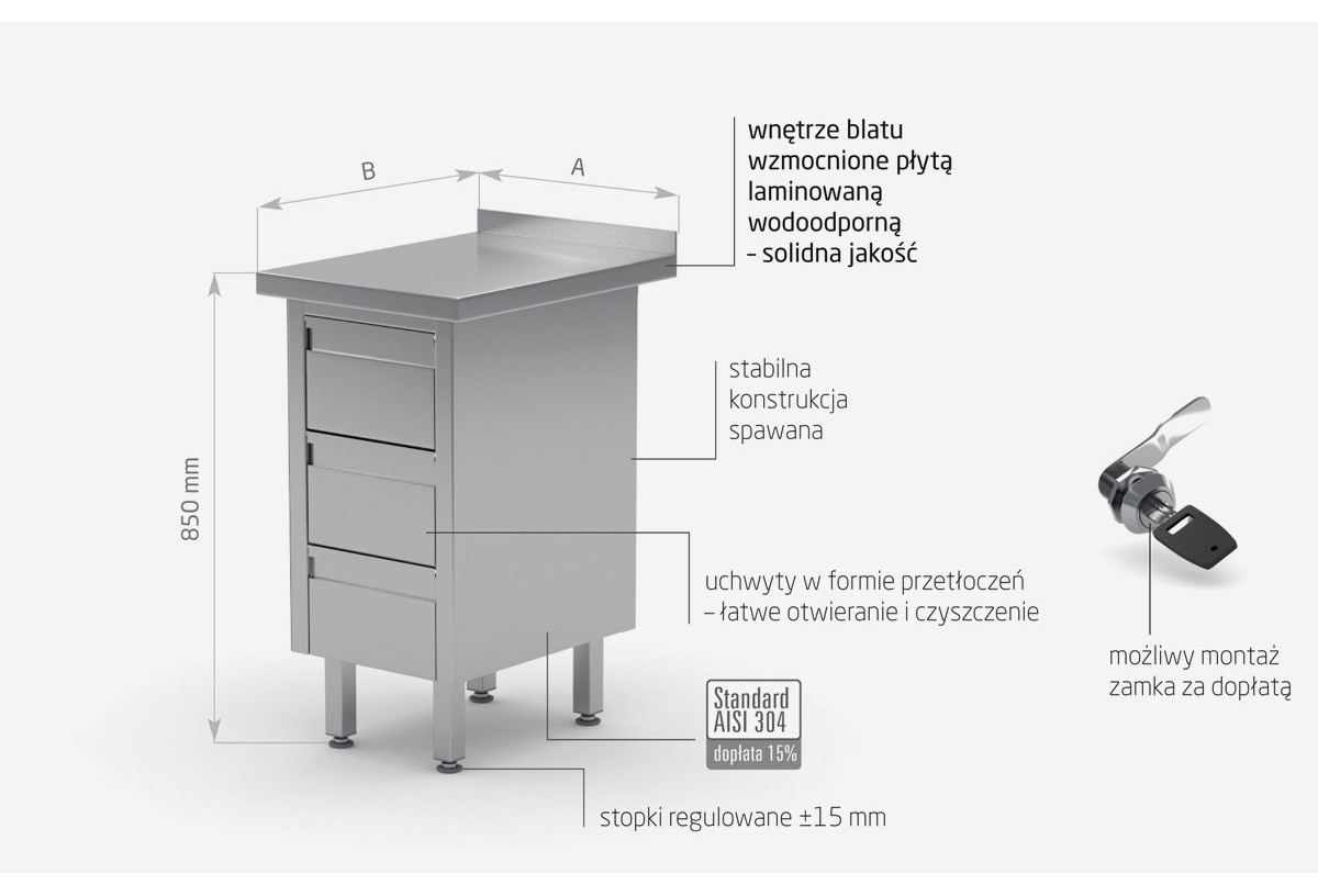 - stół z trzema szufladami wykonany z wysokiej jakości stali nierdzewnej AISI 430,