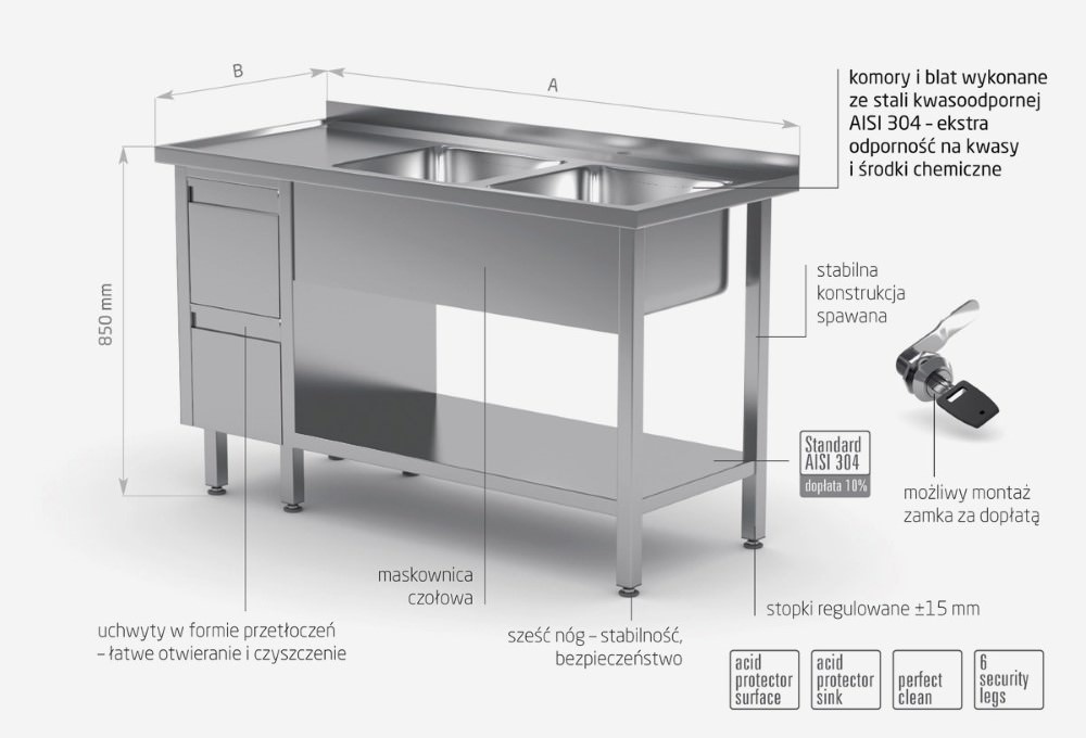 - zlewy i blat wykonane ze stali nierdzewnej tzw. kwasówki AISI 304 o wysokiej odporności na kwasy i środki chemiczne,